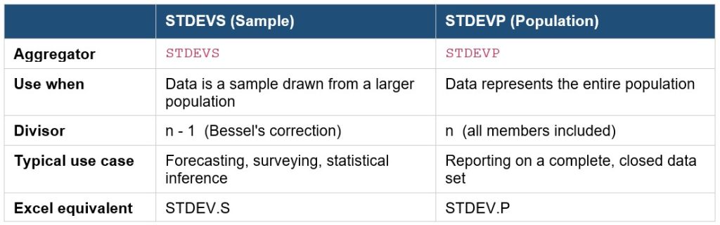 Standard Deviation Calculation in Pigment Using the REMOVE Modifier with STDEVS and STDEVP Overview Pigment supports standard deviation calculations directly within metric formulas using the REMOVE modifier. By specifying either the STDEVS or STDEVP aggregator, you can calculate the standard deviation of values across one or more dimensions — without needing a separate calculation…