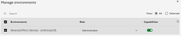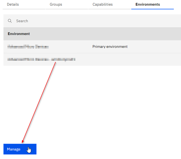 For non-production environments in the cloud, an administrator will need to enable capabilities on the user account in order to access Drive Explorer. To do this you will log into your non-prod environment and go to Users and Groups in Administration. When you click on a user you will notice that there is no Capabilities tab by default. You need to click on the Environments tab and then select the non-prod environment and then click “Manage” at the bottom.