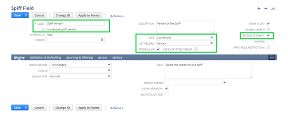 Because the SPIFF record is configured as a child of the Vendor record, NetSuite handles the relationship automatically.