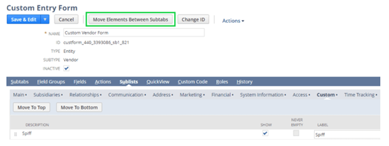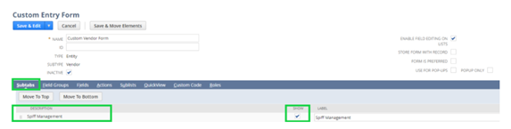 Next, we’ll modify the Vendor form to display the new subtab and the SPIFF custom record.