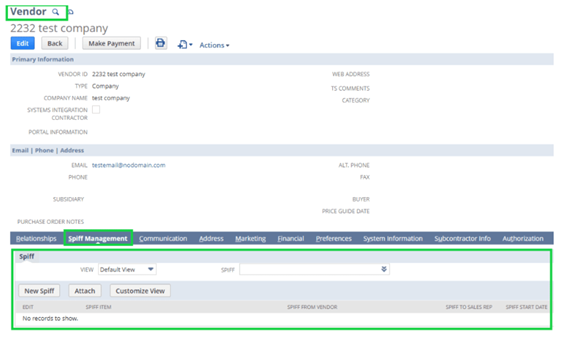 The SPIFF custom record sublist now appears under the SPIFF Management subtab on the Vendor form. When viewing or editing a Vendor record, users can: