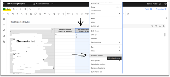 Once you are in EDIT mode, right-click on the column in the view where you want to add your conditional formatting and then select “Member format”: