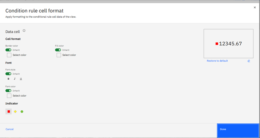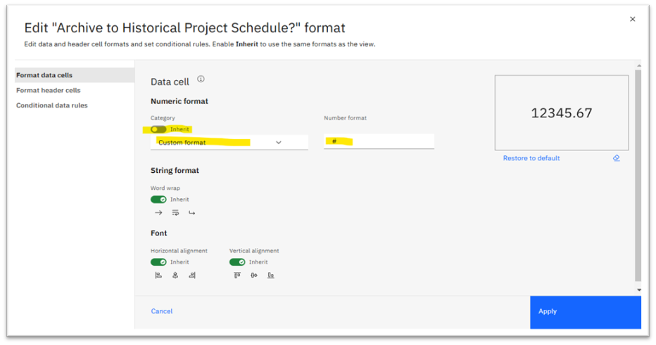As shown above, I disabled the Inherit property by clicking the toggle to the off position since we do not want this cell to inherit any formatting from the corresponding Planning Analytics cube view. Next, I selected “Custom Format” from the drop-down selector and entered a “#” for the “Number Format” value. Finally Apply was clicked.