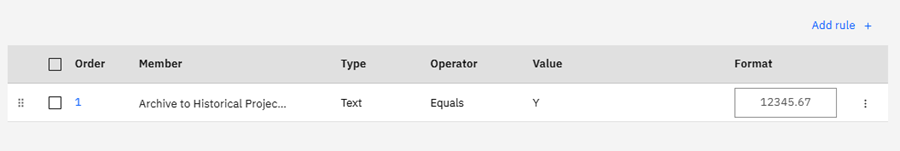 There is an Order value (this is the rule precedence or the order in which the rule will be applied (if there is more than one rule created for this cell), similar to formatting rules in MS Excel. Next, you will see Member. This is the member where I want to attach my rule (you can change the member value if you want or need to by selecting a different value from the drop-down selector). The Type will show as Text (since we formatted the cell in the prior step to a custom format of text) for Operator, I selected “Equals” and for Value I enter a “Y.”