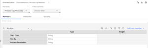 The Process Log Measures dimension has the measures which capture the information of processes. In our example, we have the Start Time, Run By, Process Parameters measures. We can add more measures, such as End Time, Process Duration, Data Source, etc.