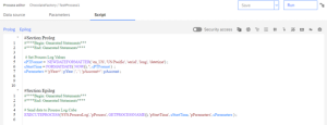 We have the code of the SYS.ProcessLog process in the screenshot below. The code in Prolog is divided into three sections: Define Constants, Move Records, and Record Parameters. The code is pretty self-explanatory, so we will not discuss the code line by line. There is no code in Epilog.