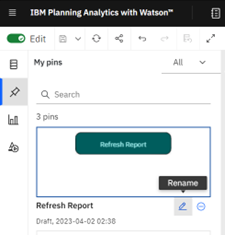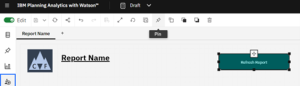 - Pin the object by clicking the Pin icon. Please note that the Pin icon is only available in the edit mode. After you pin an object, it will be available on the list of Pins and it can be used in other reports. We can rename a pin to help us search for the pin in the future.